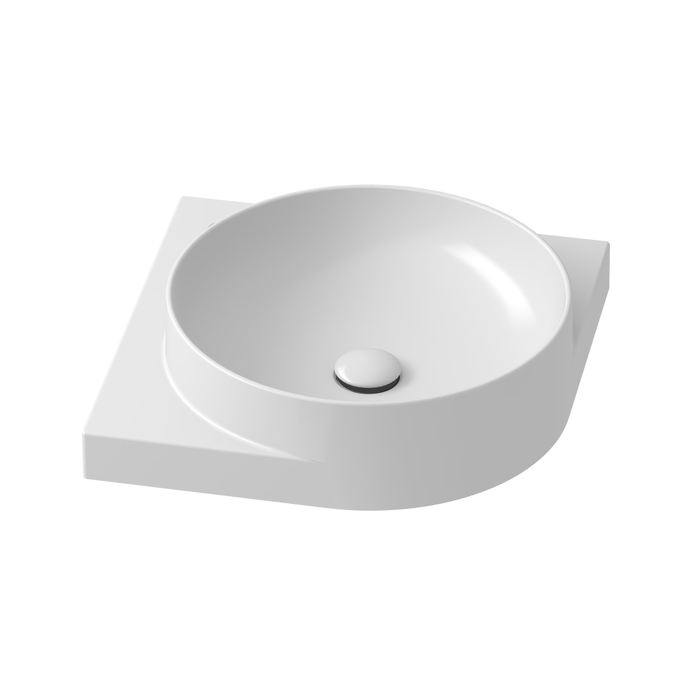 Vékonyfalú kerámia sarokmosdó Yard, Yard konzolra szerelhető, túlfolyó nélkül. Fehér kivitelben. Lyuk nélkül - falba süllyesztett mosdócsapteleppel kombinálható.