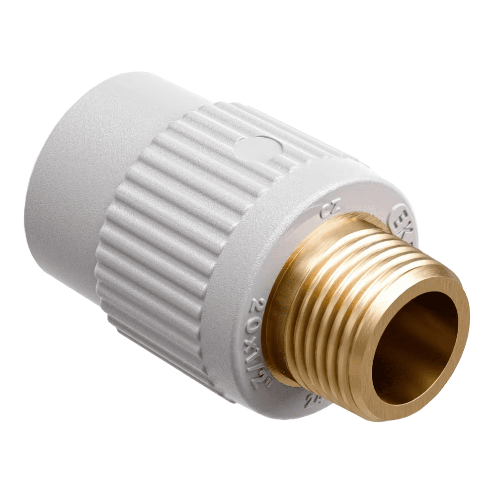 PP-RCT alapanyagú átmeneti idom fém külső menettel, amely biztonságos csatlakozást biztosít PP-RCT csövek és menetes szerelvények között