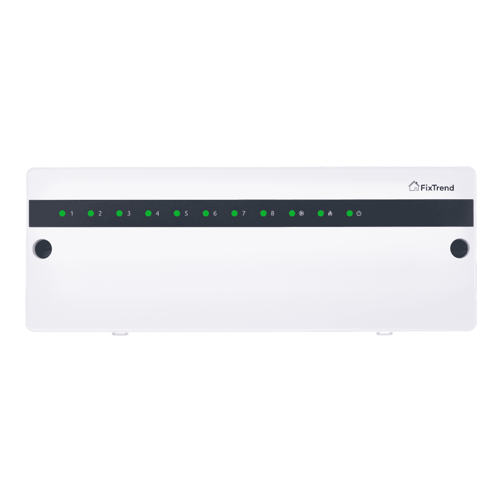 A FixTrend Blue Line vezetékes, 8 zónás szabályzó központi vezérlőegység padlófűtési és felületfűtési-hűtési rendszerekhez, amely megbízható kapcsolatot biztosít a helyiségenkénti termosztátok és a termoelektromos szelepmozgatók között. A készülék lehetővé teszi akár 8 különálló zóna önálló szabályozását, így ideális családi házak, társasházi lakások vagy kisebb közületi rendszerek kialakításához.