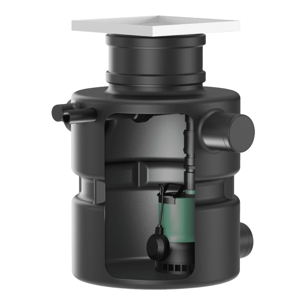 Műanyagból készült, gáz- és víztömör gyűjtőtartály lerakódásmentes belső térrel. Két 180°-kal eltolt DN 100-as csatlakozás a hozzáfolyáshoz, a légtelenítéshez és a kábelvezetéshez. A nyomócsonk-csatlakozás a két csatlakozóhoz képest 90°-kal el van tolva. A rendszer egyszerű karbantartása érdekében a burkolat ellenőrzőnyílásként szolgál.