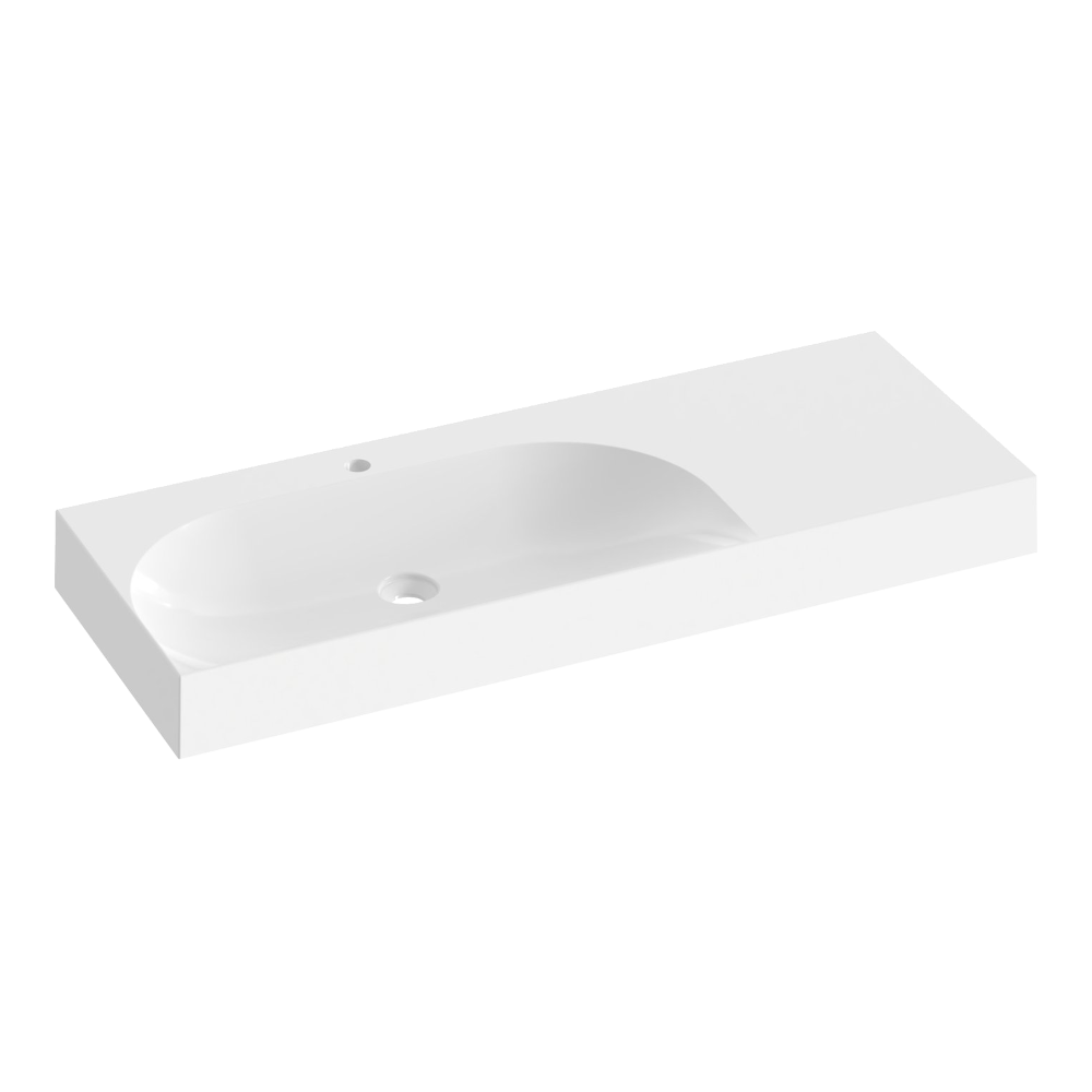 A jobb oldali kialakítás integrált tárolófelületet kínál, a csaplyuk pedig lehetővé teszi az álló mosdócsaptelep egyszerű telepítését. A túlfolyó nélküli kivitel minimalista megjelenést biztosít, ezért fix lefolyó használata javasolt.