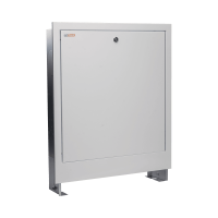 A falba építhető szekrény szerelése előtt gondosan fel kell mérni a csővezetékek tervezett elhelyezését, a padlóburkolat vastagságát- azaz a végleges magasságot, továbbá a vakolat vastagságát is. A szekrényt úgy kell beállítani, hogy az alsó keretléc a burkolattal ellátott padló magasságában legyen. A szekrényt vízszintesen állítsuk be és rögzítsük a falba, a hátlapon található 4 furat segítségével. A rögzítéshez a fal konstrukciójának megfelelő rögzítő elemeket kell használni. A szekrény hátsó falán található szerelő sínekhez bármilyen típusú osztó-gyűjtőt lehet rögzíteni. A felszerelés megkönnyítése érdekében a szerelőpontok tetszőleges irányba mozgathatók, amint a nyilak is mutatják. Oldalsó bekötés esetén ki kell törni a vak szerelési nyílásokat, melyek a szekrény oldalfalán találhatók.