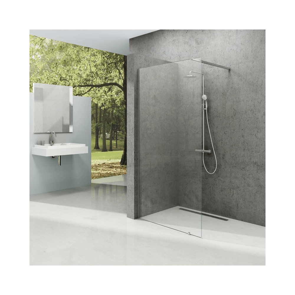 A Walk-In Wall zuhanykabint fényes, fekete vagy fehér felületkezeléssel kínáljuk. Ajánljuk, hogy a fürdőszoba burkolt sarkába, beépített zuhanyfolyókával vagy padlóba épített lefolyóval szerelje fel. A zuhanykabin univerzális, a felszerelés során választhatja a bejárat jobb vagy bal irányát. 8 mm vastag edzett biztonsági üveg alapanyag. A termék stabilitását egy fém merevítő biztosítja, amely meghatározza a nyitott bejárat szélességét.