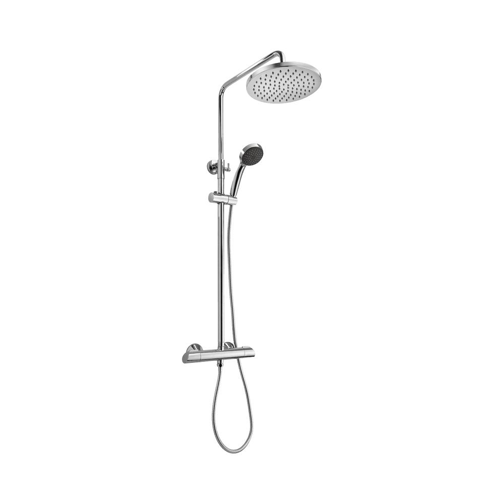 Mofém termosztátos csaptelep felső kifolyóval, megerősített 1500 mm-es fém gégecsővel, 250 mm átmérőjű zuhanyfejjel és 1 funkciós kézizuhannyal, amelynek állítható a magasságú a tartója. Integrált zuhanyváltóval, ahol alaphelyzetben a kézizuhany, váltáskor a fejzuhany irányába áramlik a víz.